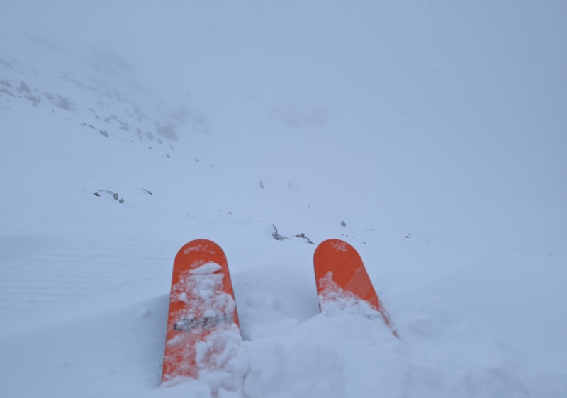 The descent from here with limited visibility was sketchy at best and not clearly signed. I can imagine that in fairer weather it could be a fun place to ski with some nice, albeit short off piste options but on this day it was not. At the bottom of the chair there is a wide area which looks quite inviting to the valley beyond but it is a run to nowhere apparently and the bunting and signs tell you so. I couldn't help but wonder if this was an untapped area worthy of opening up?!
