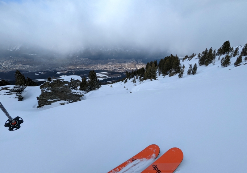 The full valley descent back down to the Tulfes lift base involves a variety of slopes & includes a superb, forest lined beginner run perfect for letting it rip in long carves (along the Halsmarter surface tow), and a fun, adventurous 'rural' section down low that crosses a road twice and lacks snow-making. It should be treated with caution in lean times, but we did it without any damage (despite the closed sign near the bottom of the Halsmarter tow!). The descent from top to bottom is well over 8km in length & one of the longest in the region. Judging by the number we passed, it also appears popular with the uphill skinning crowd too. We understand there are plans to upgrade the last few kilometres of the descent with snow-making in the near future which will make it one of the funnest trail around.