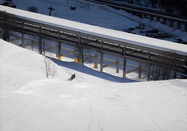 The ample skiable vertical of 800m is more than adequately served by the two well positioned chairlifts. From the top, the options are many. In-bounds piste trails for beginners and particularly intermediates, are fun, rolling runs that are as fast or slow as one desires. Trails wind through trees in the mid area. One marked advanced trail out wide to skiers’ right highlights skinning and backcountry options as well as being a rollicking joy in its own right. All the runs to the base go under the elevated roadway - a surreal experience. Can be difficult stopping oneself from ducking one’s head.
