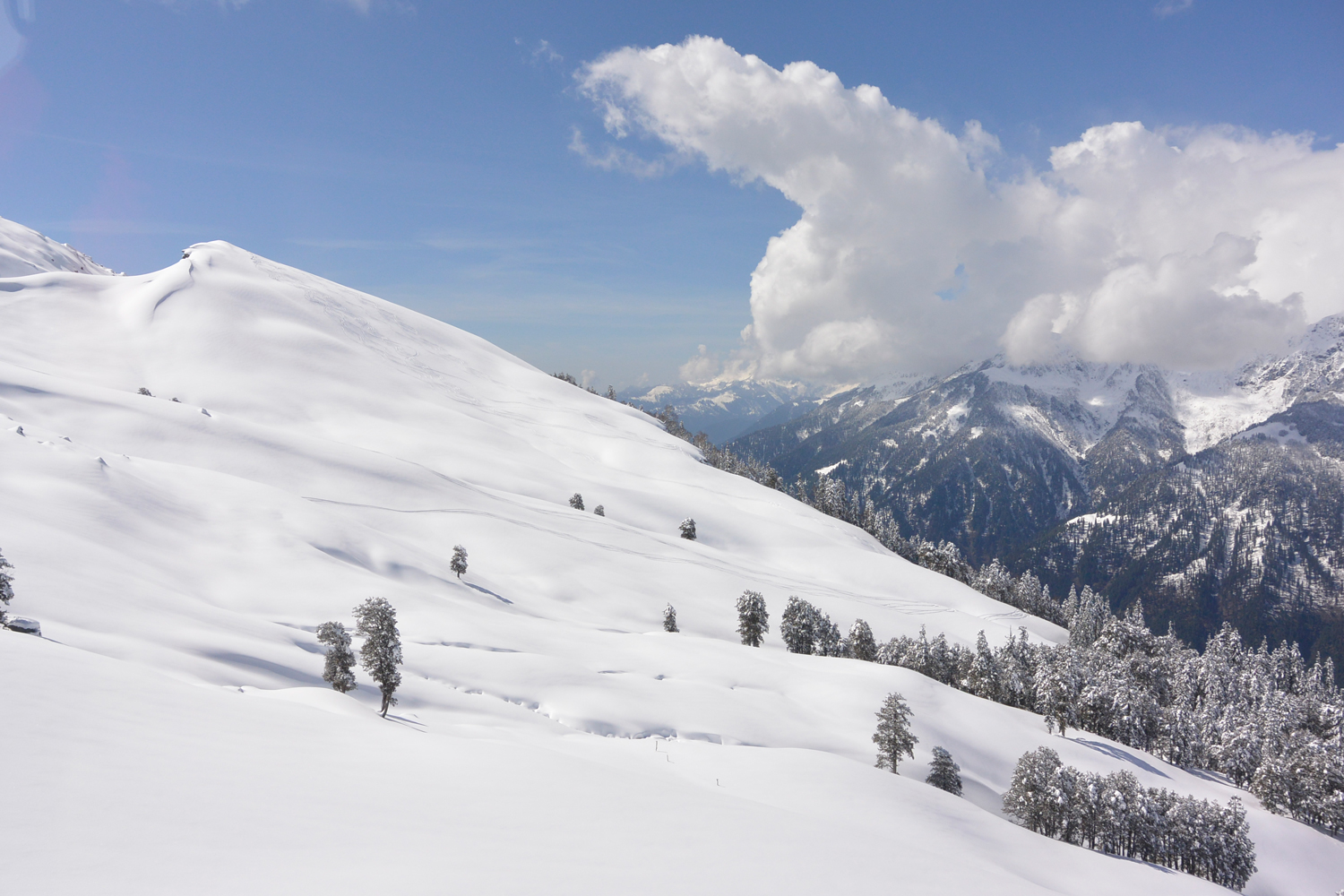 Manali sits by the Beas river at an altitude of roughly 2,000 m, surrounded by beautiful cedar forests and huge peaks soaring to more than 6,000 m. With fresh snow and cold temperatures, it’s possible to ski to the valley floor through massive cedar forests, but most skiing takes place in the alpine on long rolling ridge lines or mellow bowls or down steep cirque bowls. Both during and after storms, the skiing in the trees is excellent and includes nicely spaced birch and oak glades.
